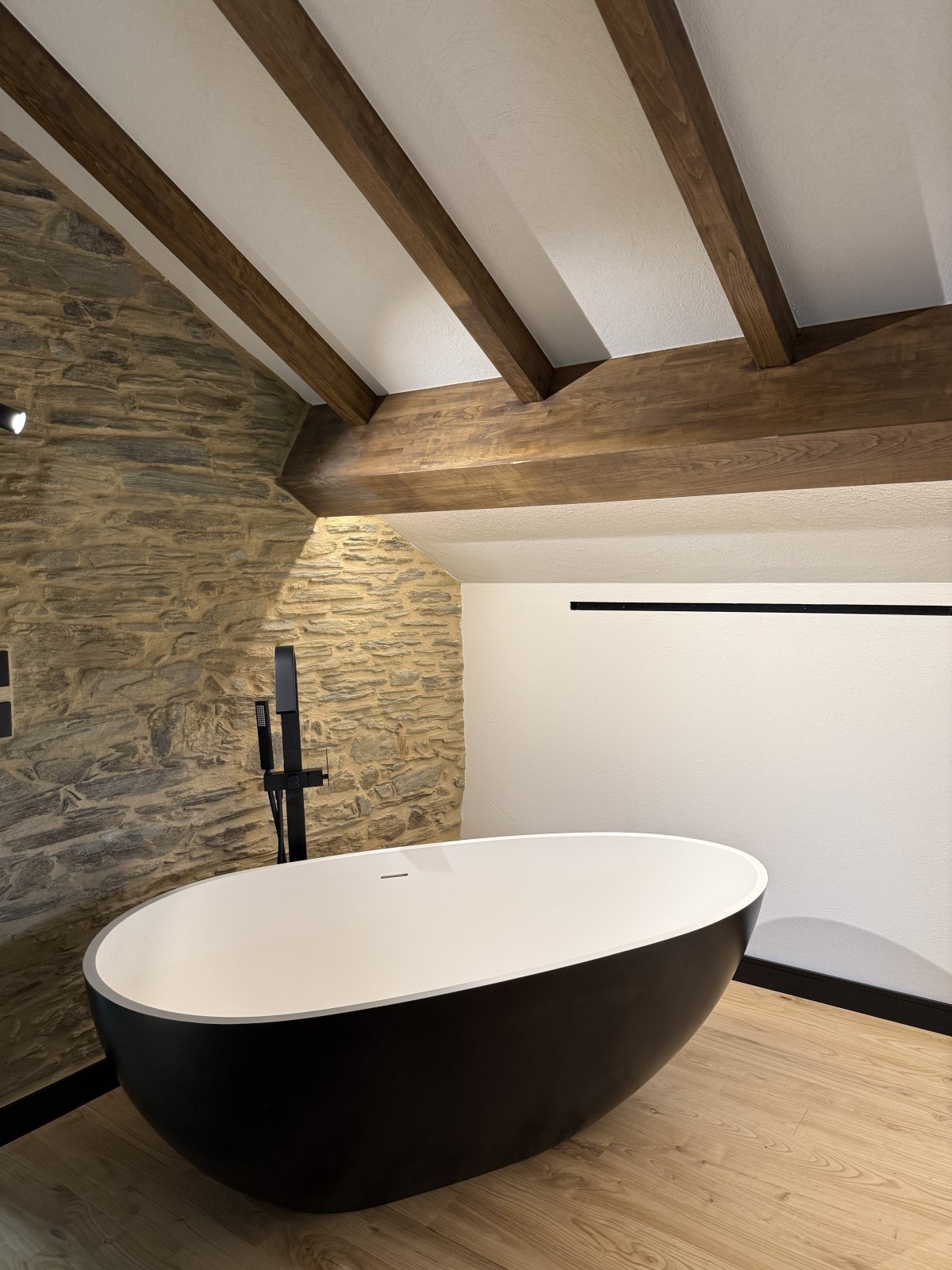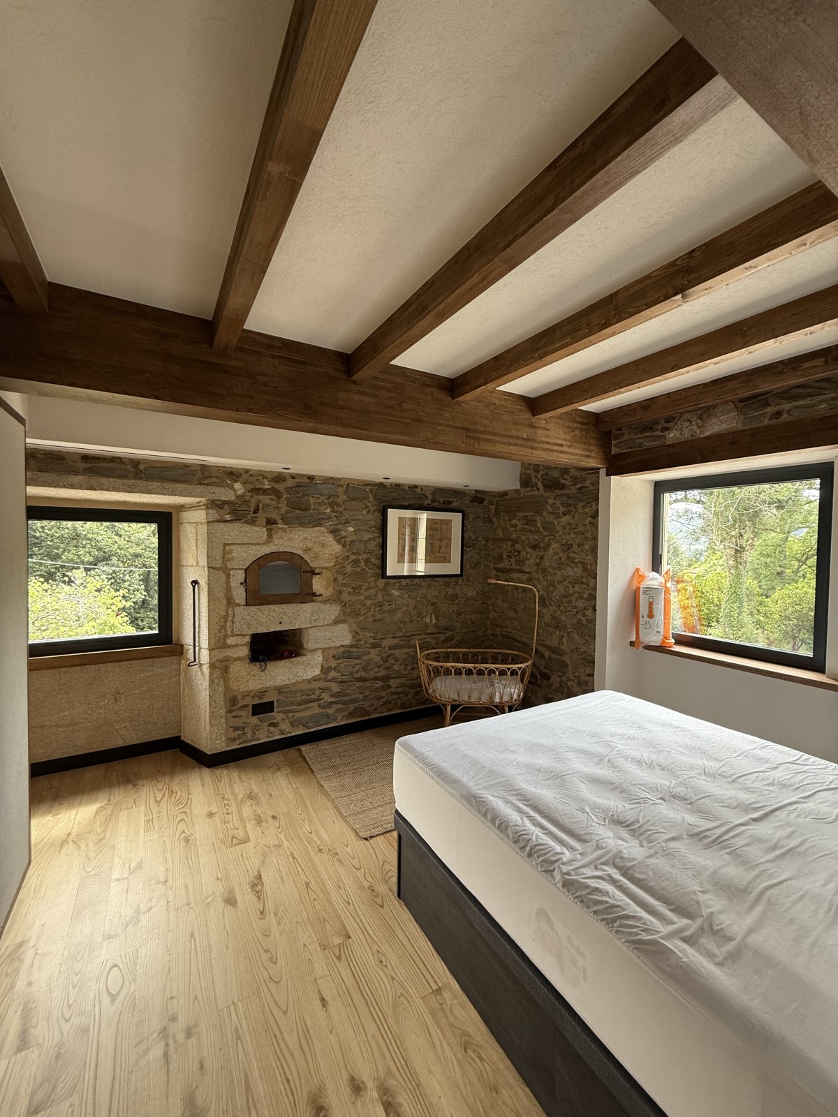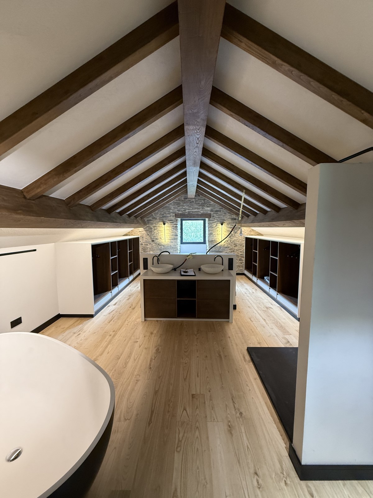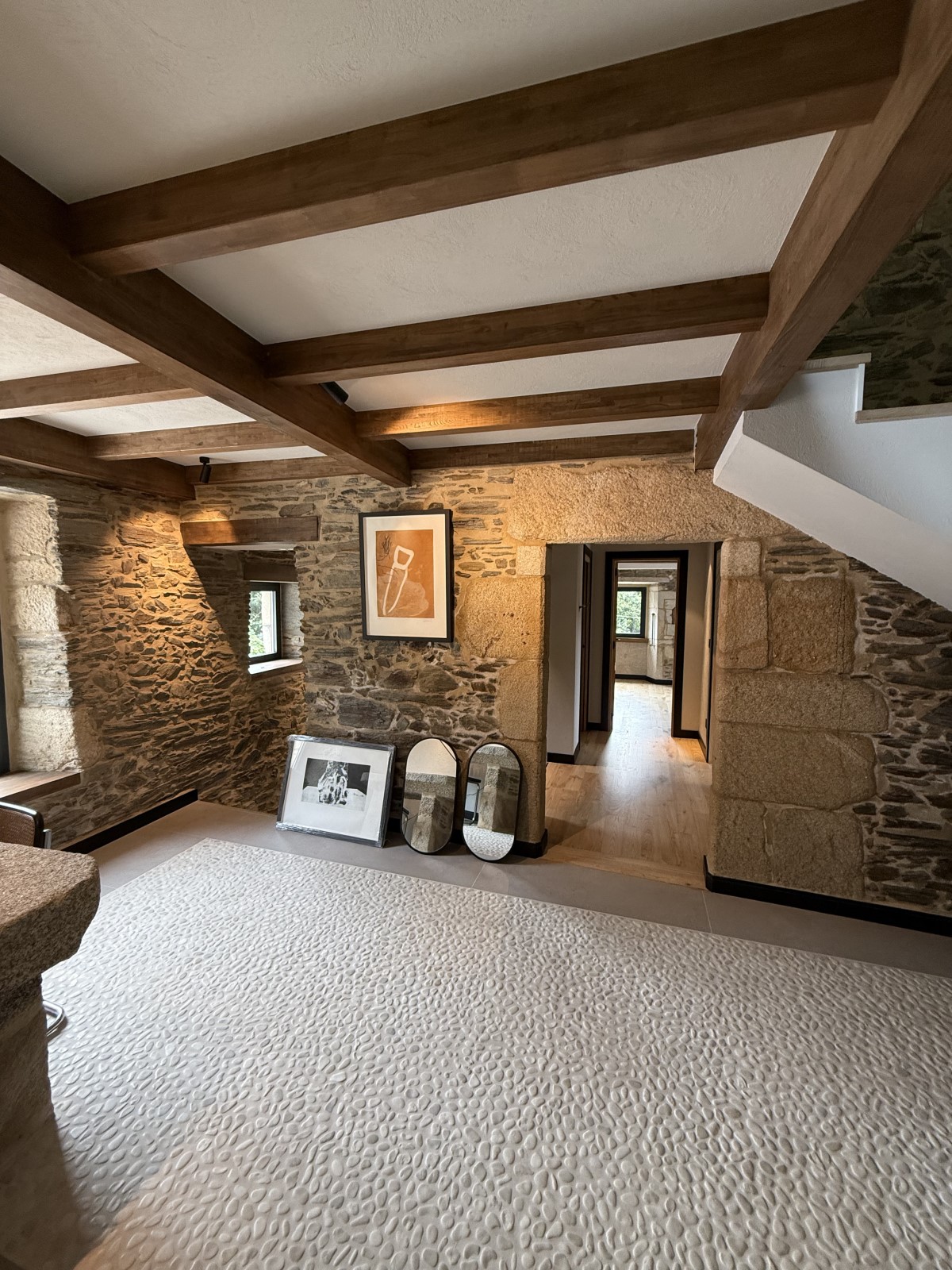 El proyecto incluyó trabajos estructurales en vigas y forjados, así como la ejecución de soluciones a medida en planta baja y bajo cubierta, adaptándonos a la arquitectura existente y reforzando la estabilidad de la vivienda. En el interior, se realizaron suelos, escaleras, remates y elementos decorativos en madera, manteniendo una estética continua y cuidada en todos los espacios.